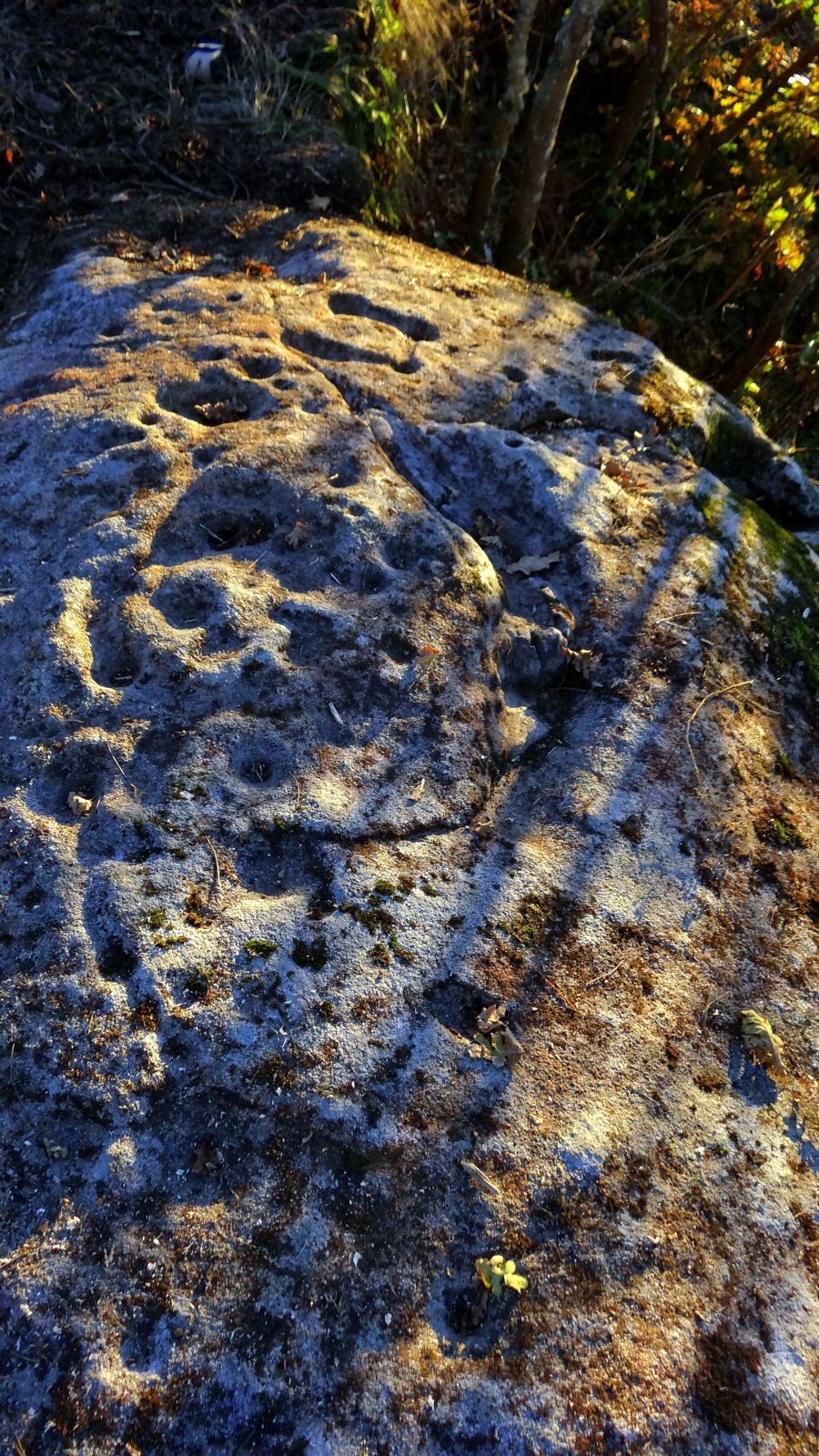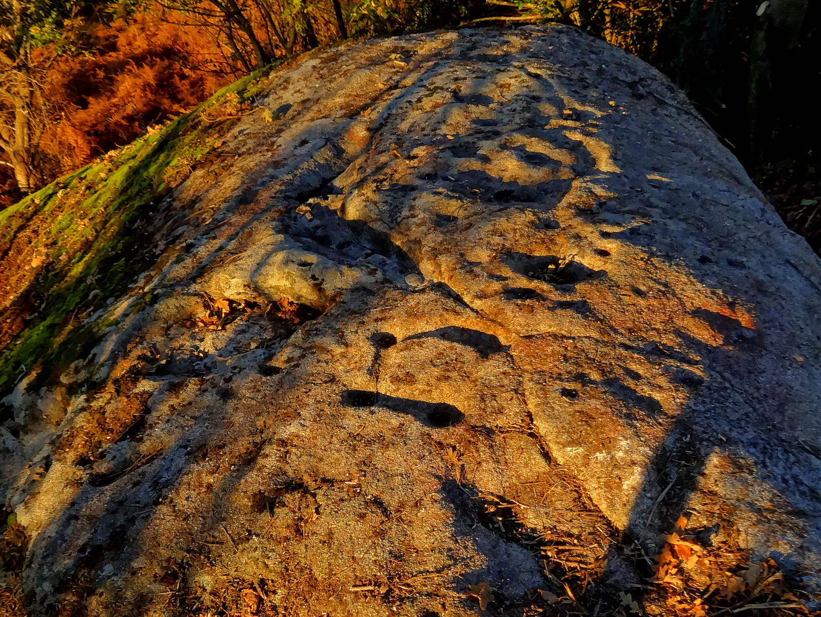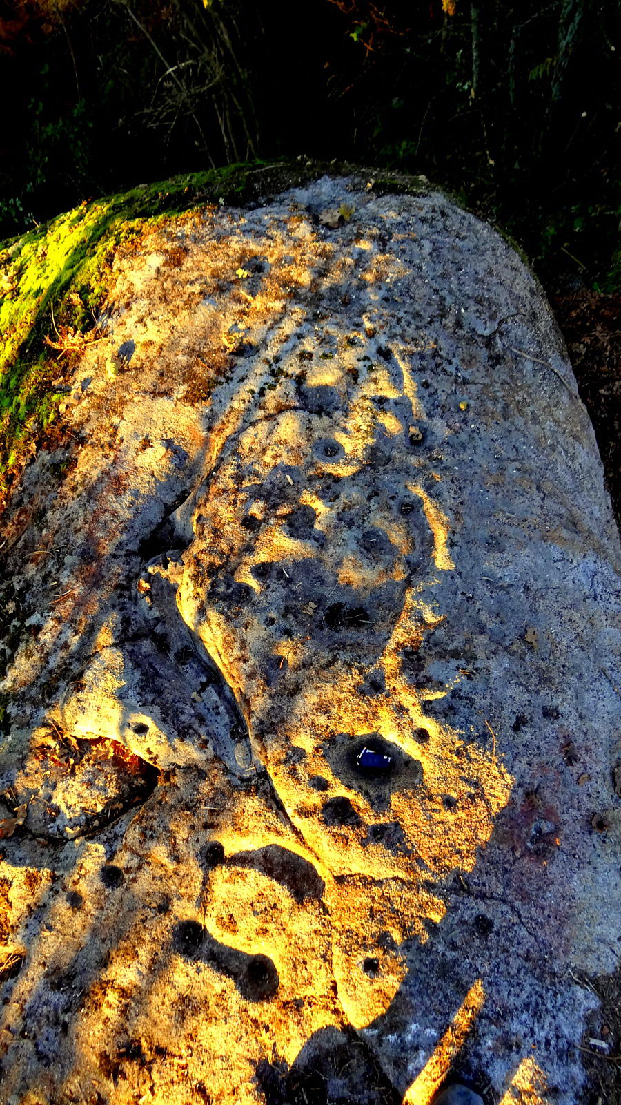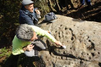 El hallazgo, hecho público ayer por los miembros del equipo de ‘O Bosque Máxico‘ Toño Monteiro y David Pérez, representa la segunda concentración de arte rupestre que aparece en el cauce del río Limia después del Monte Aieiro, en Bande. ‘Fai tempo que os veciños de Pazó tiñan coñecemento da existencia dunha pedra con buracos no fondo da finca do Luis’, relata Pérez, que hace unas semanas se lanzó a la aventura de localizarlo con Monteiro. ‘Baixamos entre toxos e maleza como xabarís’, describía el artista que, pincel en mano, apuntaba la aparición de nuevos dibujos sobre la enigmática piedra.