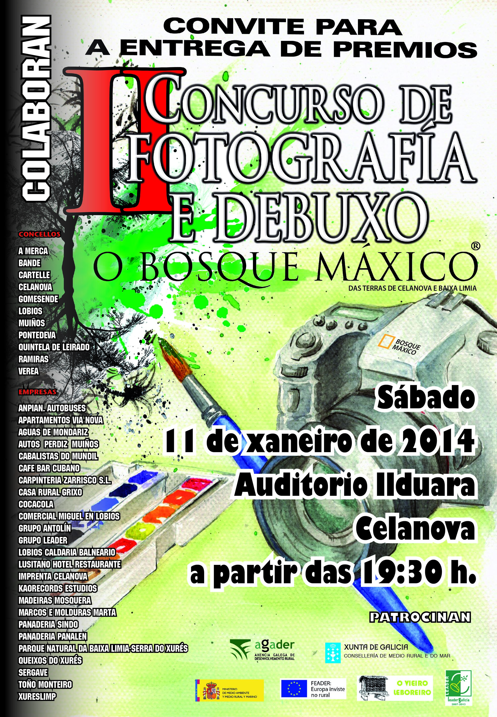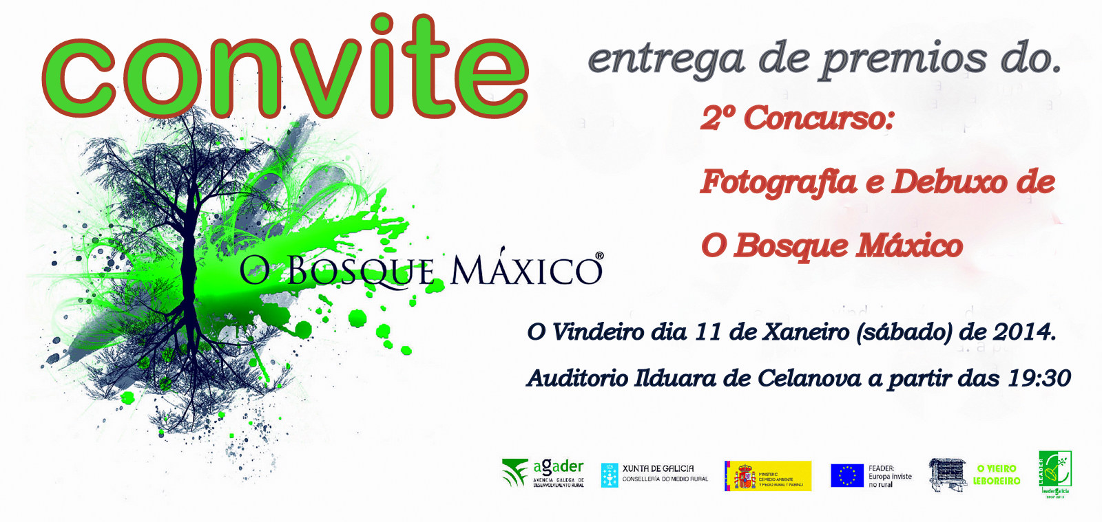 CONVITE – Á ENTREGA DE PREMIOS DO 2º CONCURSO DE FOTOGRAFÍA E DIBUXO Decembro 17, 2013 • obosquemaxico CONVITE – Á ENTREGA DE PREMIOS DO 2º CONCURSO DE FOTOGRAFÍA E DIBUXO Que se levará a cabo o vindeiro día 11 de Xaneiro ( sábado ) de 2014 no Auditorio Municipal Ilduara Celanova, a partir de las 19h 30m. Compartir: Share on X (Se abre en una ventana nueva) X Compartir en Facebook (Se abre en una ventana nueva) Facebook Gústame Cargando...